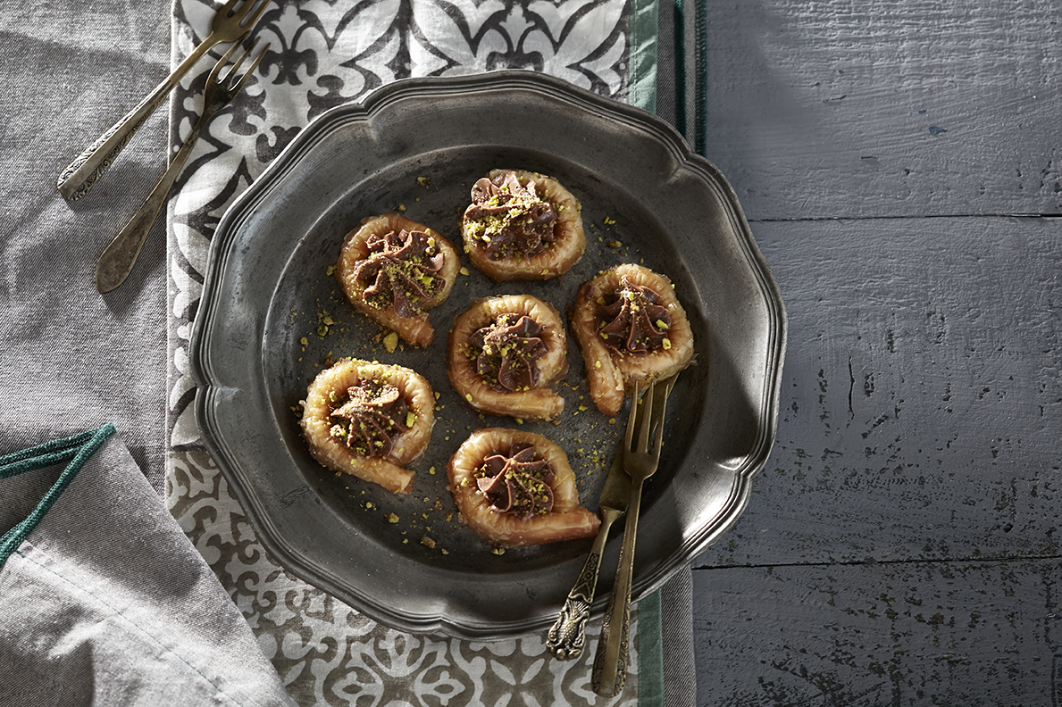 Handmade phyllo pastry with fresh butter, a touch of syrup, mixed nuts, and hazelnut praline.