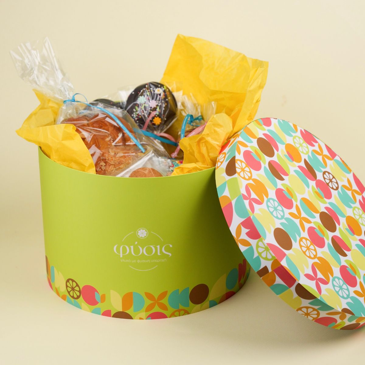 Χαρίστε στους αγαπημένους σας.. Την Γλύκα του Πάσχα! Fysis Easter Gift Box Κουτί με διπλό καπάκι, το οποίο περιλαμβάνει: 1 συσκ. πασχαλινά κουλουράκια με ζάχαρη (6 τμχ) 1 Γλειφιτζούρι σοκολάτας 1 cake pop 2 θεματικά μπισκότα βουτύρου Πάσχα