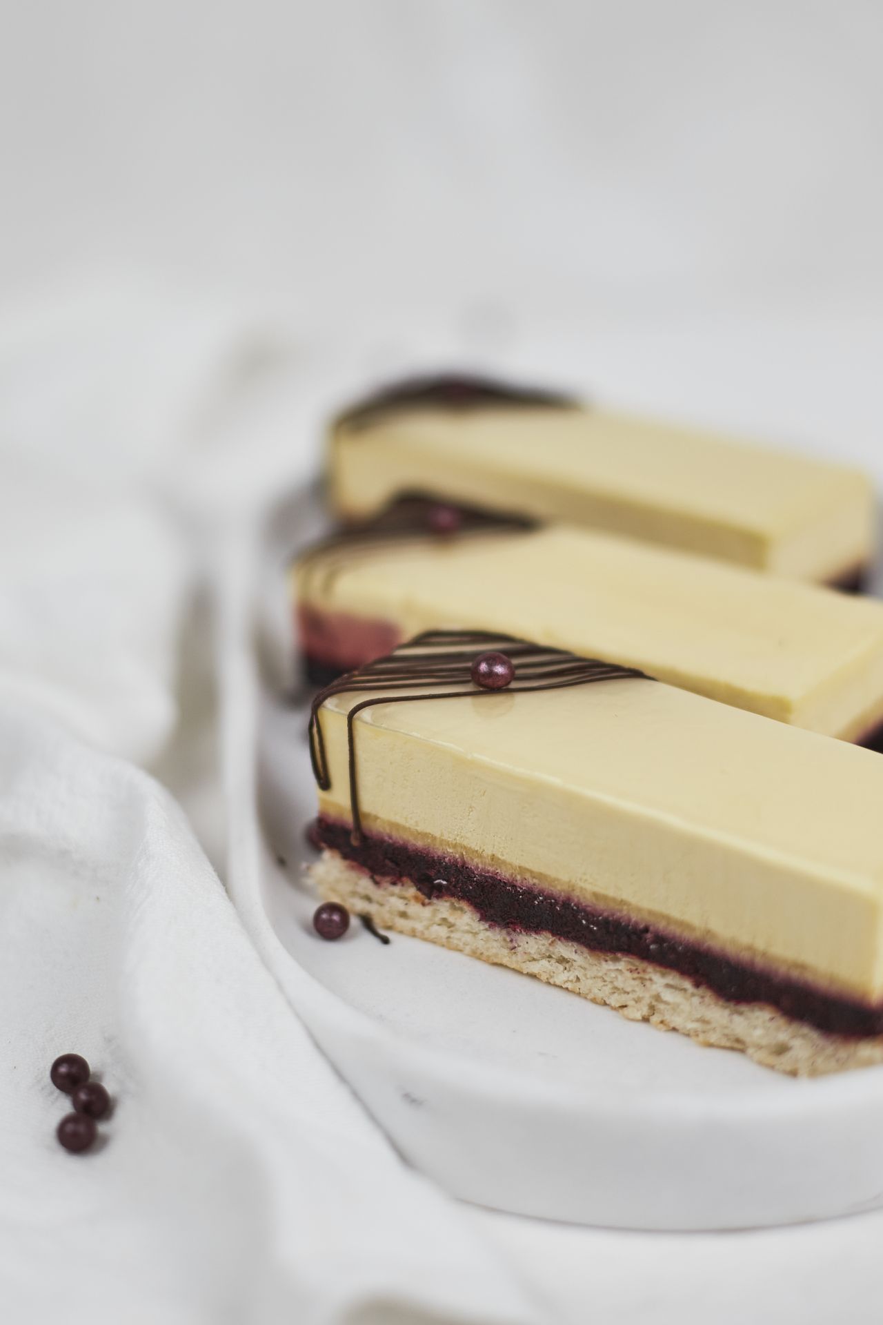 Μους βανίλιας σε διπλό cremeux λεμονιού και βιολογικού μύρτιλου πάνω σε biscuit αμυγδάλου.