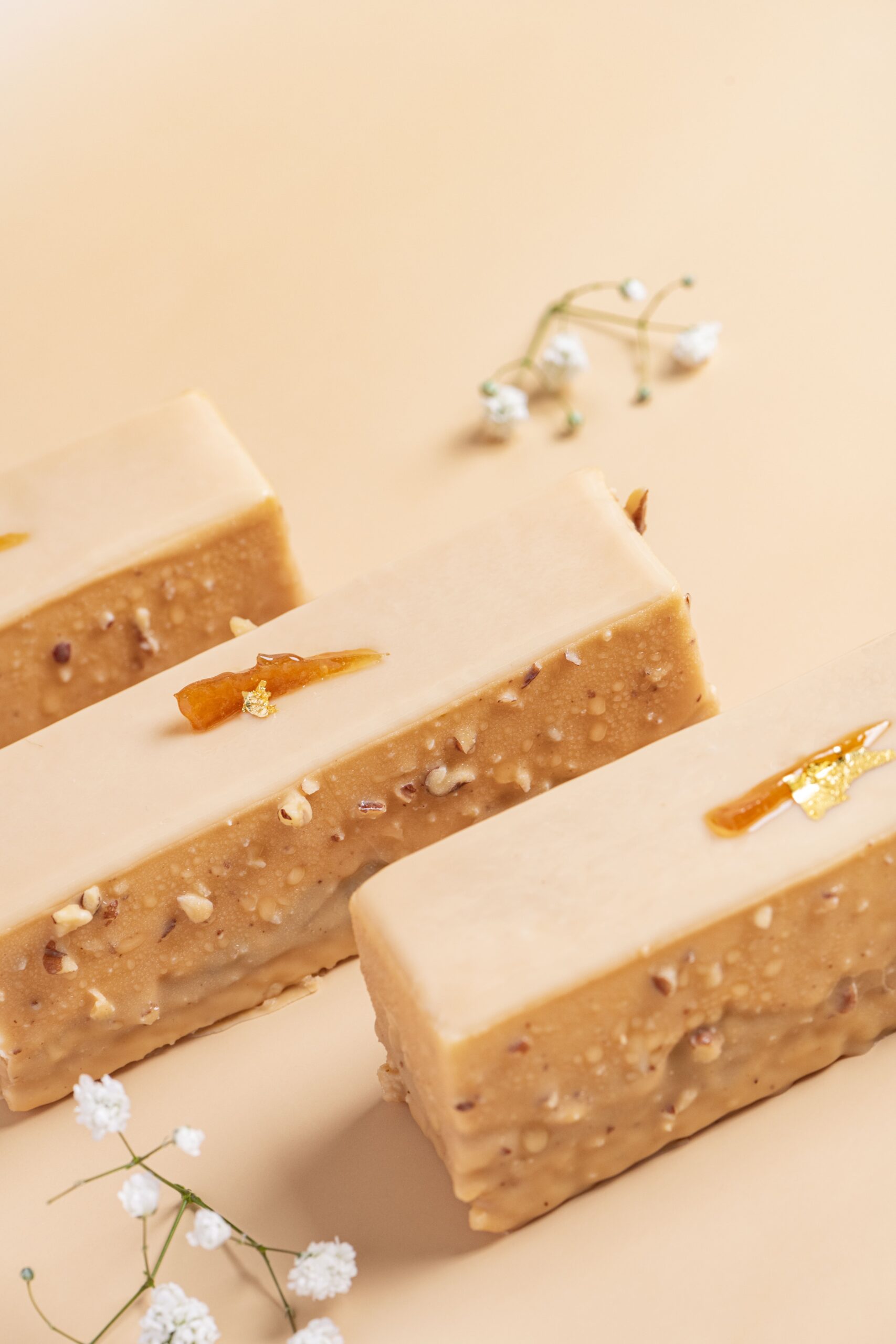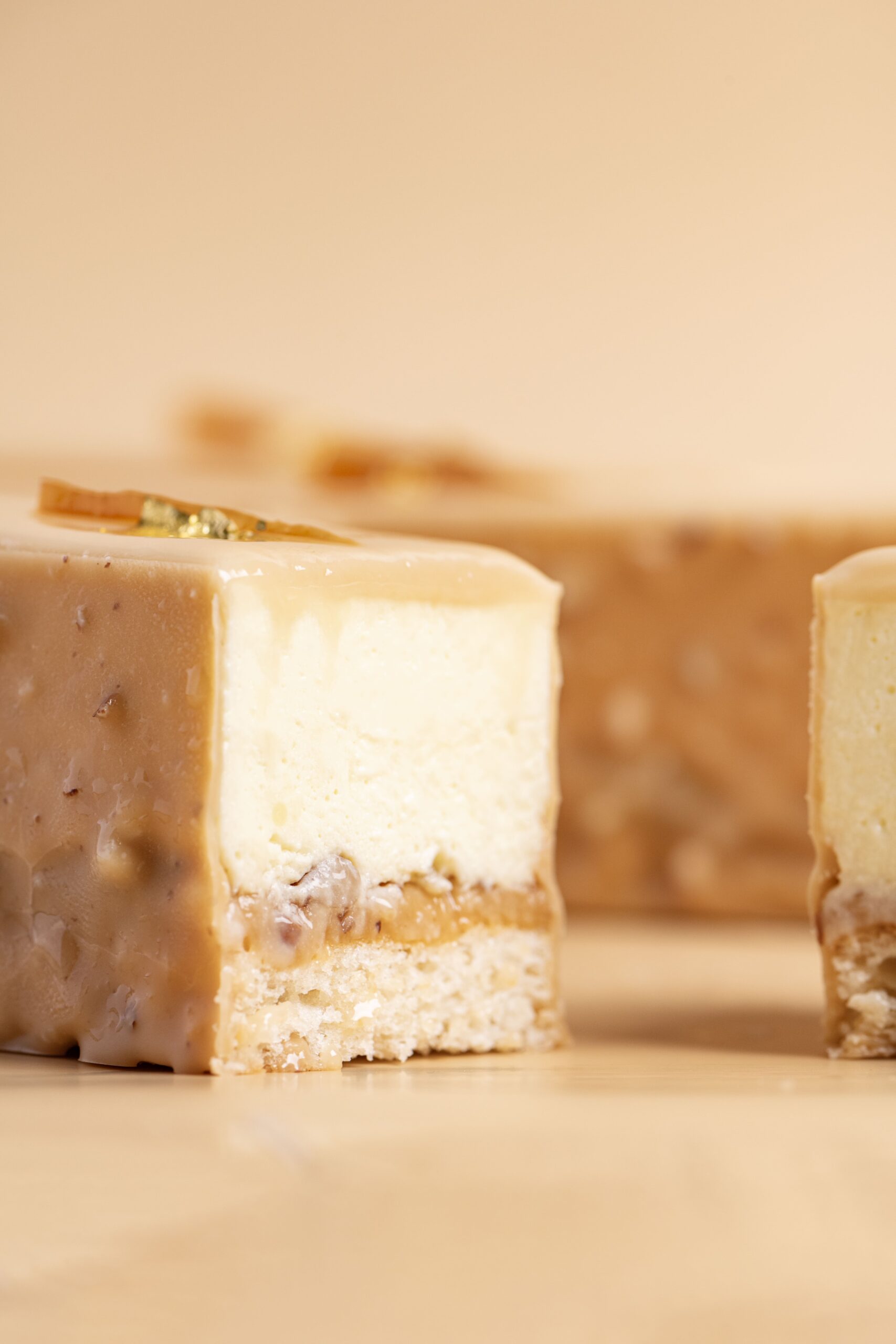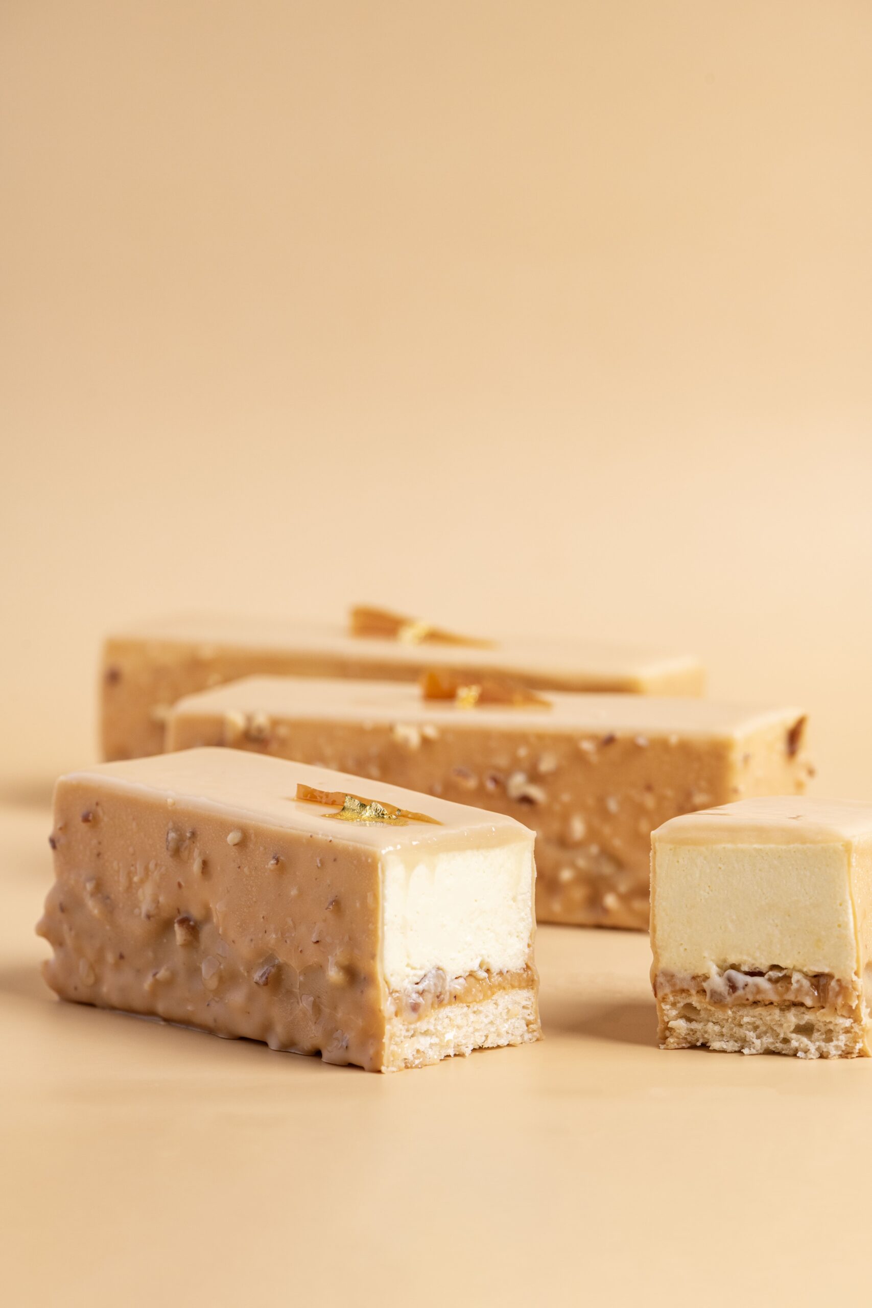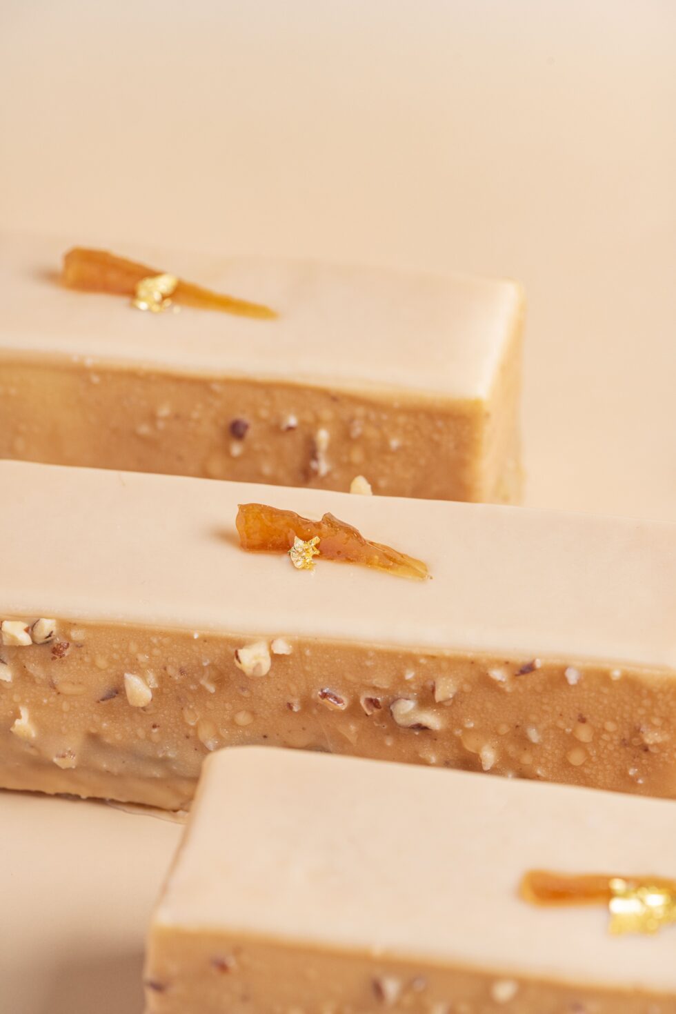Αφράτη κρέμα με άρωμα πορτοκαλιού και τόνκα σε biscuit αμυγδάλου με καραμελωμένα καρύδια pecan και επικάλυψη καραμελωμένης λευκής σοκολάτας