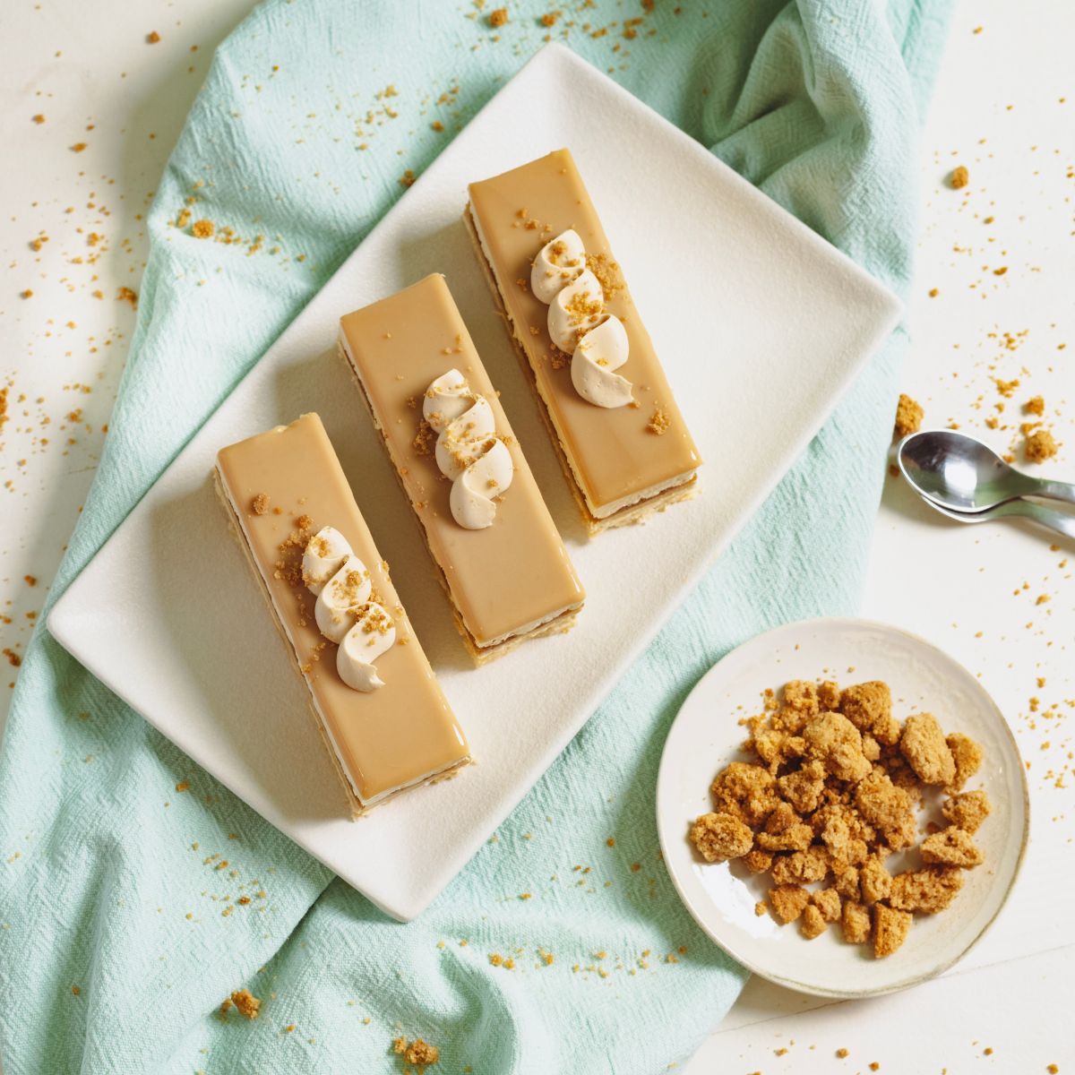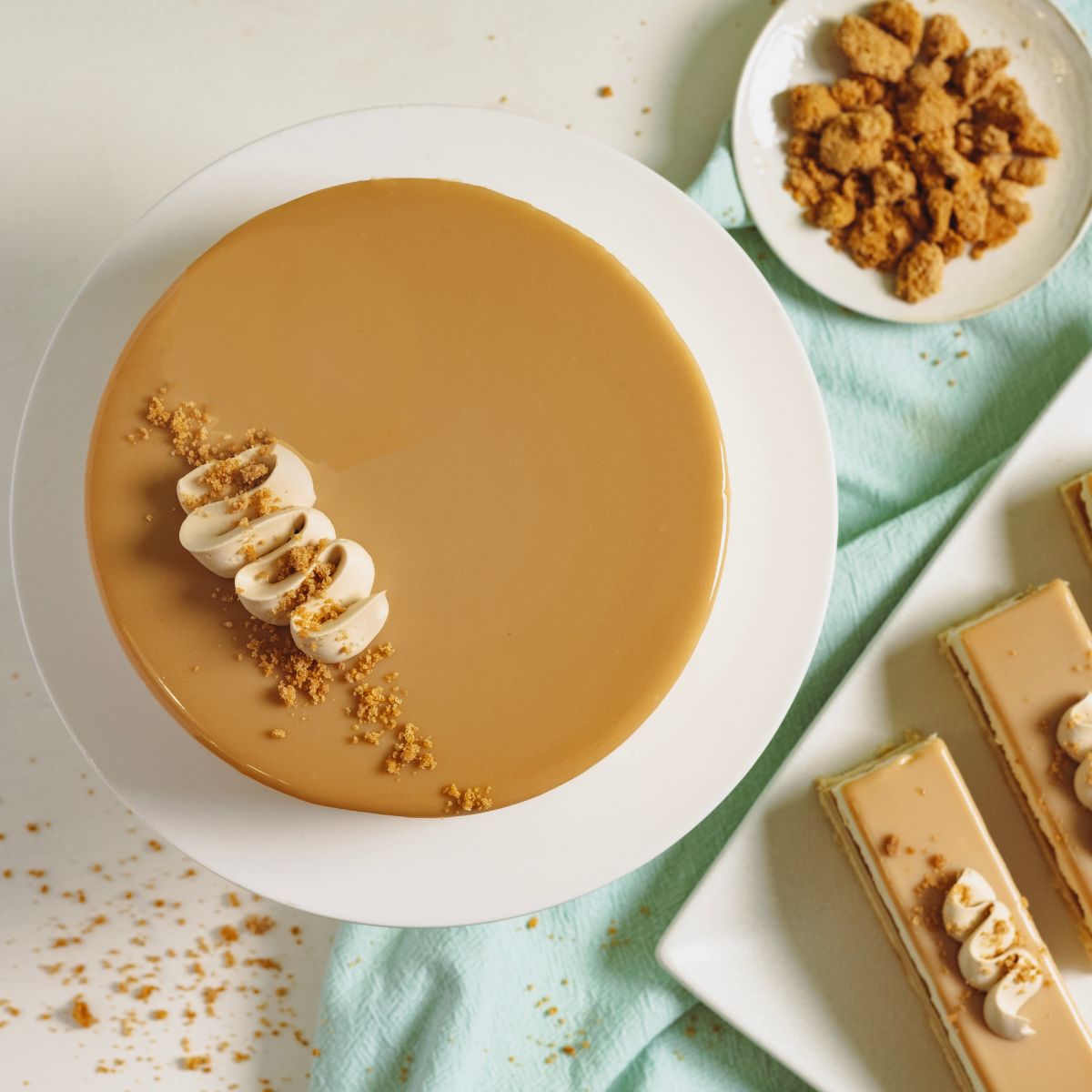 Καραμελωμένη μους λευκής σοκολάτας σε cremeux με αρώματα κανέλας και βανίλιας και εσωτερικά χειροποίητα καραμελωμένα μήλα σβησμένα με μηλίτη.