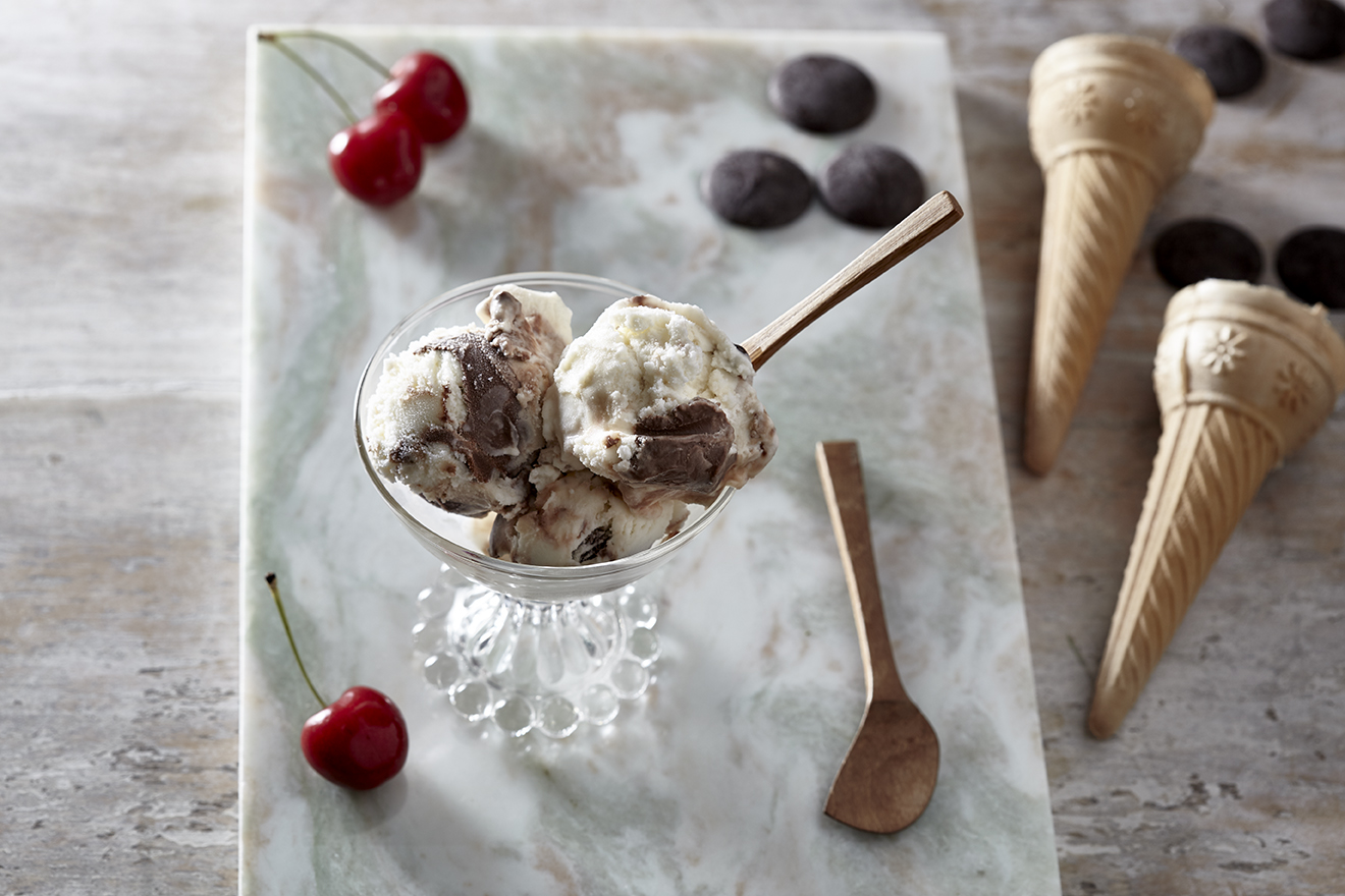 Παγωτό stracciatella από κατσικίσιο γάλα με άρωμα φυσικής βανίλιας και cremeux σοκολάτας υγείας.